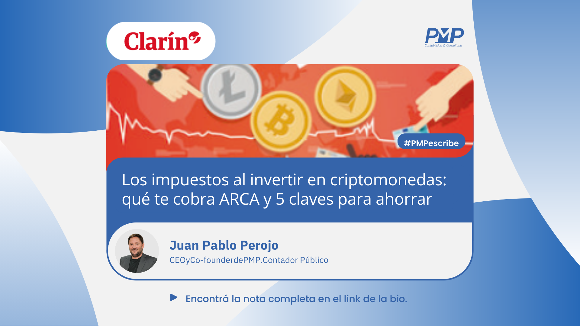 En la nota publicada por "Clarín", nuestro co-founder y CEO, Juan Pablo Perojo, responde a las dudas más frecuentes a la hora de hablar de criptomonedas y los impuestos que se recaudan por el uso o tenencia de las mismas.